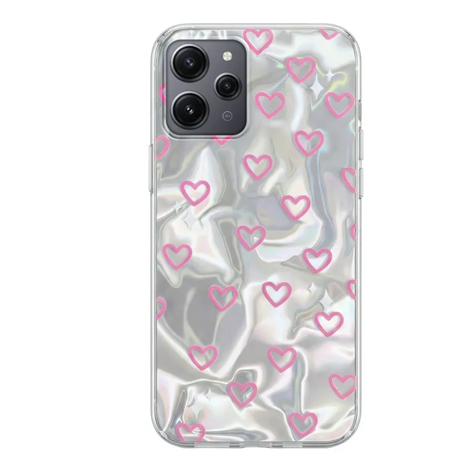 Parlak arka yüzeyi üzerinde sevimli kalp işlemeleri ile telefonuna aşk kat.